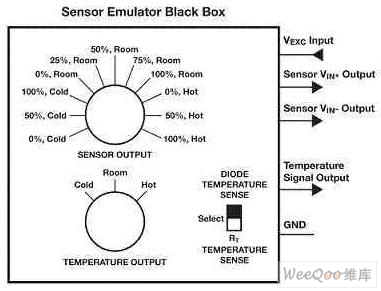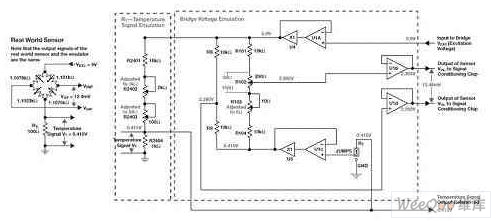 在詳細(xì)講解如何實(shí)現(xiàn)傳感器仿真器之前,可把它視作一個(gè)黑箱。本文的傳感器仿真器用于仿真四元件Wheatstone橋傳感器。由于大多數(shù)橋傳感器提供相關(guān)的溫度傳感器,因此它可效仿兩種不同類型溫度傳感器的效果(二極管和串行電阻)。