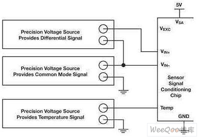在模擬傳感器的時(shí)候需要三個(gè)精確電源。一個(gè)用于共模信號(hào),一個(gè)用于差分信號(hào),另一個(gè)用于溫度信號(hào)(參見(jiàn)圖5)。這種設(shè)置比本文建議的仿真器方式成本高,而且它需要對(duì)每個(gè)傳感器輸出配置進(jìn)行重設(shè)置。而仿真器輸出配置僅需設(shè)置一次,并通過(guò)旋轉(zhuǎn)開關(guān)選擇。