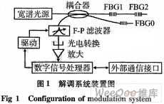 解調(diào)系統(tǒng)裝置如圖1,采用中心波長為1 550 nm的發(fā)光二極管(LED),譜寬為30 nm,LED發(fā)出的光經(jīng)過3 dB耦合器后進入FBG,F(xiàn)BG反射回的光再次經(jīng)過這個3 dB耦合器后進入F-P可調(diào)諧濾波器(FOOL2上型),再經(jīng)光電轉(zhuǎn)換、放大、D/A轉(zhuǎn)換器進入數(shù)字信號處理器(DSP)實現(xiàn)插值-相關(guān)譜法解調(diào)(FBG0是固定波長的參考FBG,這個波長基準器可以消除可調(diào)諧F-P濾波器腔長漂移對測量精度的影響)。