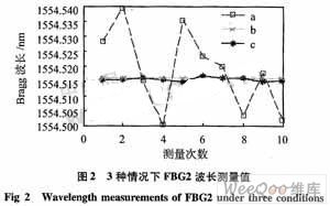圖2中,a是用傳統(tǒng)的直接求峰值的方法,其標準差為0.042 41 nm ;b是在沒插值的情況下用相關(guān)譜法,其標準差為0 nm;c是采用插值-譜相關(guān)法(每相鄰點間線性插值8點),其標準差為0.002 14 nm。表面看上去,好像b最好,但它實際上是由于每相鄰點之間的間隔太大,以至于當Bragg波長在最小的區(qū)間時,就不能清楚的分開它們,最終,將它們看作同一個值。先插入一定的數(shù)據(jù),提高分辨力后就使得原始光譜更加相似于漂移后的光譜,再運用相關(guān)譜法,就可以獲得最佳的效果。