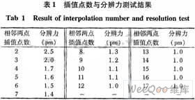 為了研究插值-相關(guān)譜法中,在一定的條件下,最好插入多少點波長分辨力最高的問題,在上面的實驗系統(tǒng)中,將每相鄰點之間的插值點數(shù)從2增加到17,得到如表1。