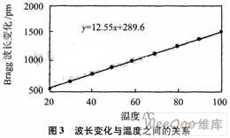 每次以10℃的步長逐步對FBG進行加溫,插值-相關(guān)譜法測得Bragg波長變化和溫度之間的關(guān)系如圖3。
