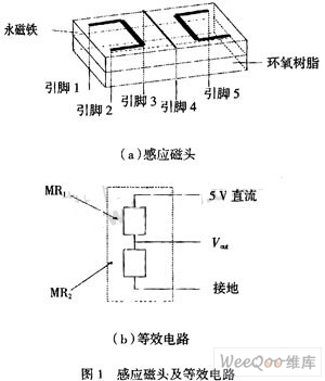 用銻化銦-銦共晶體薄膜磁阻元件制成MRCS的感應(yīng)磁頭(圖1)主要由導(dǎo)線、絕緣基片、InSb-In磁阻元件MR1和MR2、永磁體、5個(gè)引腳等組成,另外加上起屏蔽和保護(hù)作用的金屬外殼。MR1和MR2是相對(duì)放置的一對(duì)磁阻元件,其阻值大致相等,導(dǎo)線置于MR1和MR2的對(duì)稱軸位置。其等效電路如圖1(b)。