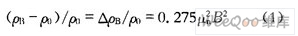 式中:B是磁感應(yīng)強(qiáng)度;ρB和ρ0分別為有磁場(chǎng)和無磁場(chǎng)時(shí)InSb-In磁敏電阻器的電阻率;μn為載流子的遷移率。這種InSb-In共晶體薄膜磁敏電阻器的磁阻特性仍遵守InSb單晶的規(guī)律,為拋物線形狀的曲線,可用一元二次三項(xiàng)式表示為