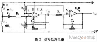信號(hào)采集電路中的InSb-In薄膜磁阻元件采用三端差分型接法如圖1(b)所示,這種信號(hào)采集電路具有輸出信號(hào)較大和較強(qiáng)抑制溫漂的能力。信號(hào)處理電路采用阻容耦合型差動(dòng)放大電路,在圖2中IC1和IC2為兩級(jí)差動(dòng)放大,改變R2,R7,R5,R8的阻值可以調(diào)整放大倍數(shù)。集成運(yùn)放的靜態(tài)電壓由R3和R6來調(diào)節(jié),考慮到通常磁頭內(nèi)的上、下兩個(gè)磁阻元件不完全平衡,MR1與MR2的阻值會(huì)有10%以內(nèi)的差別,在+5 V的工作電源下,信號(hào)采集的輸出端電壓在2.4~2.6 V。為了減少信號(hào)在磁頭與運(yùn)放之間阻容耦合中的損失,一般把集成運(yùn)放靜態(tài)電壓設(shè)置為低于2.5 V,取2 V比較合適。
