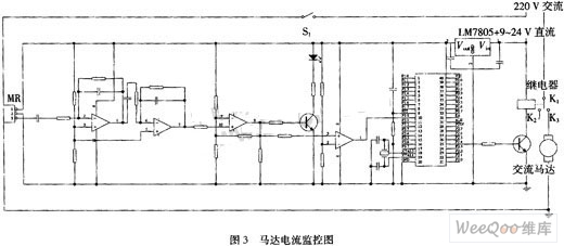 本文研制的電流傳感器已經(jīng)在馬達(dá)監(jiān)控方面獲得了實(shí)際應(yīng)用。眾所周知,馬達(dá)一旦被意外卡死而停轉(zhuǎn),電路中流過它的電流會(huì)遠(yuǎn)遠(yuǎn)高于正常工作的電流,而馬達(dá)長(zhǎng)時(shí)間停轉(zhuǎn)的話,很容易被燒壞,本電流傳感器就是要感知馬達(dá)停轉(zhuǎn)的電流,從而把整個(gè)供電斷開,起到保護(hù)馬達(dá)的作用,其基本原理如圖3所示。