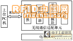 傳感探測網(wǎng)絡內(nèi)的信息與外部網(wǎng)絡或處理中心的連接需要通過sink點來實現(xiàn)。sink點是無線傳感器網(wǎng)絡與有線設備連接的中轉(zhuǎn)站,負責發(fā)送上層命令(如查詢、分配ID地址等)、接收下層節(jié)點的請求和數(shù)據(jù),具有數(shù)據(jù)融合、請求仲裁和路由選擇等功能,是無線傳感器網(wǎng)絡中最重要的一部分。設計中sink點由上位PC機與無線通信適配單元組成,如圖4所示。無線收發(fā)模塊仍采用nRF401芯片配以環(huán)形差分天線。以3 V電壓供電,TTL與RS232電平轉(zhuǎn)換單元選用MAX3316芯片。該芯片在2.25~3.0 V供電即可實現(xiàn)兩通道雙向電平轉(zhuǎn)換,可直接操作nRF401芯片串行數(shù)據(jù)線DIN/DOUT、控制線TXEN。但實驗結果表明,該設計方式中上位PC機通過API函數(shù)調(diào)用或串口控件方式來操作口線會產(chǎn)生較高的誤碼率,須涉及更底層的寄存器操作才能高效地實現(xiàn)數(shù)據(jù)提取。這無疑增加了設計的復雜性,故sink點在實際制作中選用具備2路UART通道的MSP430F149芯片作為無線與有線串行傳輸?shù)倪B接與處理單元,實現(xiàn)數(shù)據(jù)初級的封裝與分解,為上位機提供便攜的接口方式。