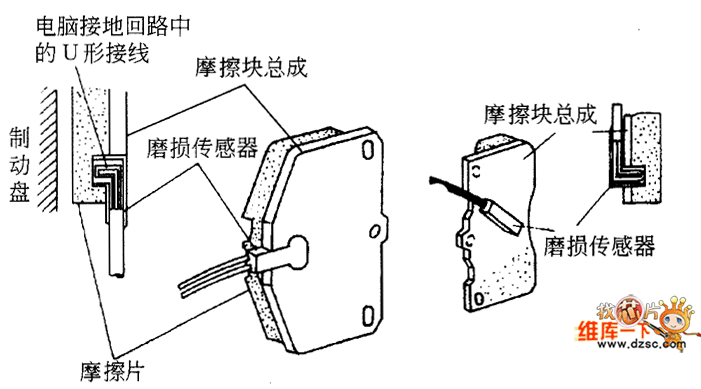 磨損檢測傳感器用于檢測汽車制動器摩擦片的磨損情況。安裝在制動蹄摩擦片上的傳感器如圖1所示。摩擦片磨損情況的檢測方法有兩種,當制動蹄摩擦片超過磨損允許的限度時,一種方法是使磨損檢測傳感器本身被磨損,另一種方法是使其接觸磨損檢測傳感器。