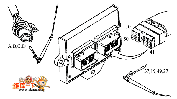 。9)檢查是否開路。測量37與A、19與B、49與C、27與D端子間電阻,阻值小于10Ω為合格。否則為不合格,應對發(fā)動機線束進行維修,如圖4所示。