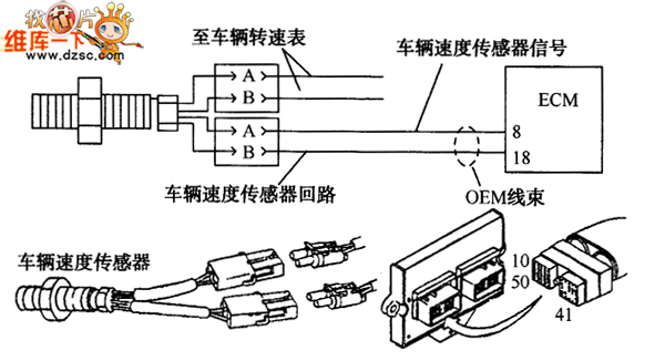 在OEM線束的8端子和18端子上檢測不到車輛速度信號,ECM則認(rèn)為故障,并以故障碼242的形式存儲該故障,黃色故障指示燈點亮。這時發(fā)動機將工作在沒有車速傳感器的最大發(fā)動機轉(zhuǎn)速內(nèi)。