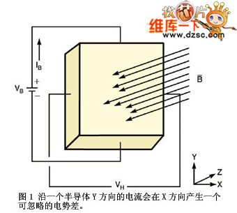 霍爾效應(yīng)IC作為接近傳感器,用于接近檢測和旋轉(zhuǎn)機(jī)構(gòu)的角速度測量等應(yīng)用。霍爾效應(yīng)器件可以在沒有機(jī)械接觸情況下檢測機(jī)械旋轉(zhuǎn)。這種無害檢測是基于霍爾效應(yīng)的磁特性。沿Y方向流經(jīng)一個半導(dǎo)體的電流會在X方向產(chǎn)生一個可忽略的電勢差(圖1)。當(dāng)電流的右向(Z向)存在一個磁場時,X方向的半導(dǎo)體上就出現(xiàn)一個位移電壓。這個效應(yīng)就是霍爾電壓VH。