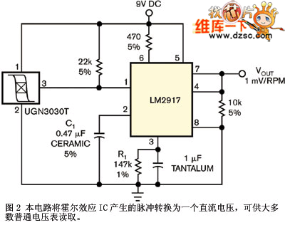 圖2中的電路將來自霍爾效應(yīng)的脈沖轉(zhuǎn)換為一個直流電壓,多數(shù)普通電壓計就可以讀取;魻栃(yīng)IC提供的是集電極開路輸出。你只需要一只上拉電阻。傳感器對產(chǎn)生的系列脈沖作轉(zhuǎn)換,用美國國家半導(dǎo)體公司的LM2917頻率-電壓轉(zhuǎn)換器轉(zhuǎn)成電壓。選擇C1和R1,根據(jù)本器件電荷泵部分會遇到的頻率范圍調(diào)整輸出電壓。對一個四沖程的單缸引擎,到5000 r/min就足夠了。