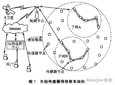 無線傳感器網(wǎng)絡(luò)是由大量部署在觀測環(huán)境中的微型、廉價、低功耗的傳感器節(jié)點,以無線、自組織的方式,通過多跳通信而快速形成的網(wǎng)絡(luò)系統(tǒng)。WSN的典型布撒是通過飛行器撒播、人工埋置和火箭彈射等方式來完成的。圖1給出了傳感器網(wǎng)絡(luò)體系結(jié)構(gòu)一般形式的描述。