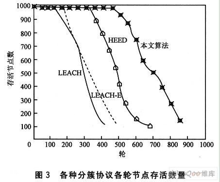 本部分比較各種分簇協(xié)議對網(wǎng)絡(luò)存活時間的影響。圖3顯示了網(wǎng)絡(luò)中存活節(jié)點數(shù)目的各輪變化情況。從圖中可以看出,無論是第一個節(jié)點死亡的時間還是最后一個節(jié)點死亡的時間,本文算法均優(yōu)于其他3種協(xié)議。節(jié)點死亡時間的跨度可以反映出網(wǎng)絡(luò)中節(jié)點的能量均衡情況,時間跨度短說明網(wǎng)絡(luò)的能量使用高效。本文算法不僅顯著地延長了網(wǎng)絡(luò)的生存時間,而且時間跨度也小于其他3種協(xié)議,這說明該算法很好地均衡了網(wǎng)絡(luò)中所有節(jié)點的能量消耗。