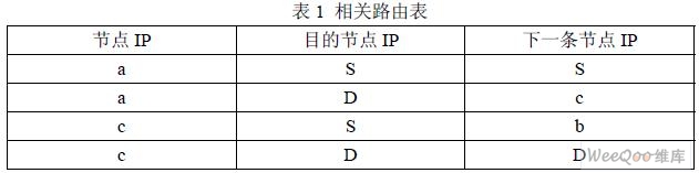 網(wǎng)絡(luò)中的每一個(gè)節(jié)點(diǎn)都有這樣的一個(gè)路由表,該表保存了對(duì)應(yīng)節(jié)點(diǎn)的路由信息,由于各個(gè) 節(jié)點(diǎn)在網(wǎng)絡(luò)中的位置不同,因而他們的路由表項(xiàng)也不相同,例如在圖2(b)中,a 節(jié)點(diǎn)的路由表有 兩項(xiàng),c 節(jié)點(diǎn)的路由表也有兩項(xiàng),如表1 所示。
