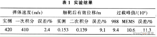 從表1看出,該傳感器在侵徹鋼靶實(shí)驗(yàn)中,由所測過載波形一次積分所得的速度誤差為2.4%,二次積分所得位移誤差為9.1%,加速度值與988傳感器對比誤差為11.3%;具有良好的抗過載能力。實(shí)驗(yàn)結(jié)果表明,在侵徹混凝土靶實(shí)驗(yàn)過程中,傳感器出現(xiàn)梁斷裂現(xiàn)象。