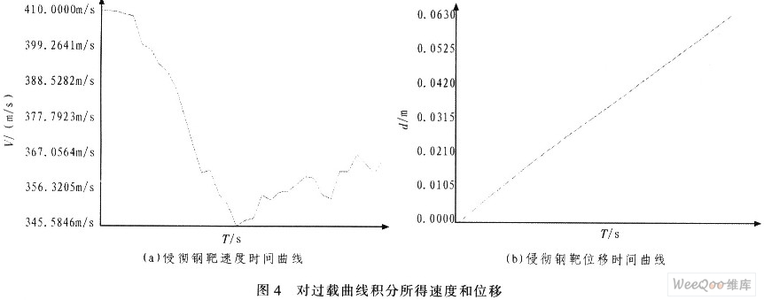 對濾波后的侵徹鋼靶過載波形進(jìn)行一次和二次積分。得到彈體侵徹初速和位移(即侵徹深度)的時間曲線,分別如圖4a、b所示。為分析所測得數(shù)據(jù)的可靠性,對應(yīng)比較侵徹過載積分得到彈體速度有效位移和鋼靶實(shí)測彈速度實(shí)測位移,并比較兩傳感器測得的加速度值,濾波頻率為50 kHz,分析結(jié)果見表1。