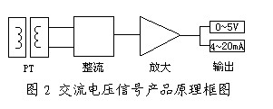 交流信號又分為交流電壓和電流信號。圖1為交流電流信號的檢測原理框圖,圖2為交流電壓信號的檢測原理框圖,由CT和PT對信號進(jìn)行隔離,電流為穿孔輸入方式,電壓為端子接線輸入方式。