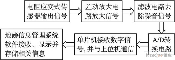 首先, 利用由電阻應(yīng)變式傳感器組成的測量電路測出壓力信號(hào), 經(jīng)過信號(hào)的放大、濾波, 然后以模擬信號(hào)的方式傳送到A /D轉(zhuǎn)換器。其次, 將經(jīng)A /D轉(zhuǎn)換后的的數(shù)字信號(hào)由單片機(jī)傳送給上位機(jī)。最后, 在上位機(jī)以MyE clipse6. 0. 1 為開發(fā)環(huán)境, 構(gòu)建一個(gè)地磅信息管理系統(tǒng), 用于接收、顯示并存儲(chǔ)相關(guān)信息。具體方案如流程圖1。