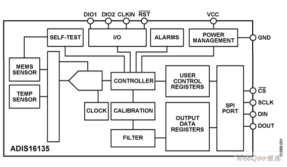 ADIS16135采用最高2048 SPS的采樣數據速率,并提供一個均值/抽取濾波器結構,以權衡噪聲和帶寬關系。串行外設接口(SPI)和用戶寄存器結構允許輕松訪問配置控制選項和校準的傳感器數據,適合嵌入式處理器平臺。
