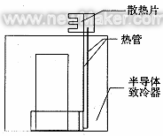 基于上述情況,我們采用局部半導(dǎo)體致冷,用絕熱管將半導(dǎo)體致冷器熱端熱量傳到儀表外,用擴(kuò)大面積自然冷卻或強(qiáng)制風(fēng)冷將熱量散掉。該方案在需要散發(fā)熱量不是很大時(shí),可以采用圖5所示的結(jié)構(gòu)。