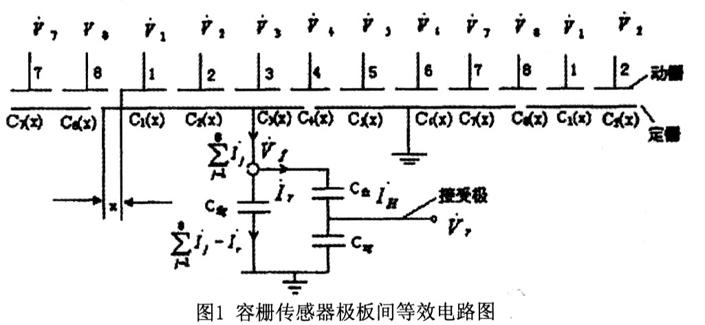 在x為任何值時(shí),動(dòng)?xùn)派系?8塊極板中總有一部分與“地”(屏蔽板)形成電容,相應(yīng)的輸入信號(hào)源直接接入“地”,對(duì)傳感器的輸出信號(hào)不產(chǎn)生影響,可是為了導(dǎo)出φ(x)(φ(x)為傳感器的輸出信號(hào)相對(duì)于某一驅(qū)動(dòng)信號(hào)的相位移)隨位移量x連續(xù)變化的統(tǒng)一公式,在推導(dǎo)中不考慮這些極板對(duì)“地” 形成電容,而仍把它們看作對(duì)定柵板形成電容,只不過此時(shí)它們的電容量為零而已。由于這些電容量為零,則其阻抗為無窮大。相應(yīng)的信號(hào)源全部落在這些電容上,同樣,對(duì)傳感器的輸出信號(hào)無影響。