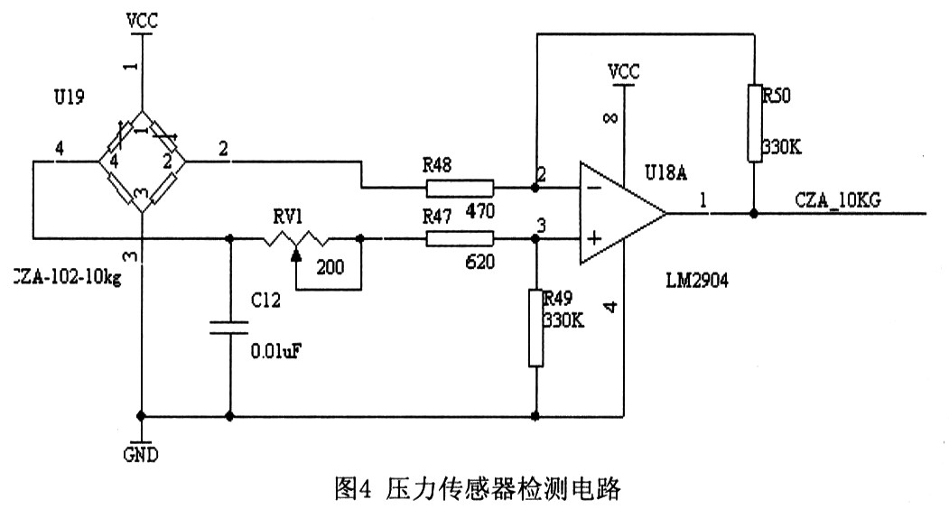 在產(chǎn)品中我們采用CZA-102的壓力傳感器,此傳感器的芯片具有精度高、漂移小、測(cè)試范圍大的特點(diǎn),當(dāng)注射器的針頭的阻力大于正常值時(shí),壓力傳感器即可檢測(cè)到電壓信號(hào)的變化,然后經(jīng)過放大,再經(jīng)過模數(shù)轉(zhuǎn)換,轉(zhuǎn)換為數(shù)字信號(hào)。
