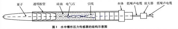 該傳感器以具有壓電效應(yīng)的電氣石為敏感元件,內(nèi)部填充硅油,采用高絕緣密封膠進行密封。工作時,將傳感器放入水下離爆炸源一定的距離,當(dāng)炸藥爆炸后產(chǎn)生的壓力通過水,以沖擊波的形式向各個方向傳播,電氣石晶體將感受到的壓力信號轉(zhuǎn)換成的電信號,從而實現(xiàn)能量的轉(zhuǎn)換。
