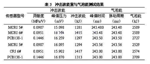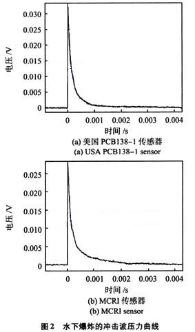 。2)試驗方法:試驗時,將研制的傳感器及測試系統(tǒng)與美國PCB公司的138型激波傳感器和專用的信號采集裝置同時進行測量對比。試驗波形曲線如圖2所示。傳感器的爆炸沖擊波能及氣泡能測試測試數(shù)據(jù)見表3。