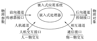物聯(lián)網(wǎng)的物聯(lián)源頭是嵌入式系統(tǒng)。嵌入式系統(tǒng)誕生于嵌入式處理器,距今已有30多年歷史。早期經(jīng)歷過電子技術(shù)領(lǐng)域獨(dú)立發(fā)展的單片機(jī)時代,進(jìn)入21 世紀(jì),才進(jìn)入多學(xué)科支持下的嵌入式系統(tǒng)時代。從誕生之日起,嵌入式系統(tǒng)就以“物聯(lián)”為己任,具體表現(xiàn)為:嵌入到物理對象中,實(shí)現(xiàn)物理對象的智能化。20年前,筆者在《MCS51系列單片機(jī)應(yīng)用系統(tǒng)設(shè)計(jì)》[1]一書中提出過單片機(jī)應(yīng)用系統(tǒng)的4個通道接口的概念,它適用于一切嵌入式應(yīng)用系統(tǒng),是物聯(lián)網(wǎng)的物聯(lián)基礎(chǔ)。圖2描述了嵌入式系統(tǒng)的物聯(lián)源頭。