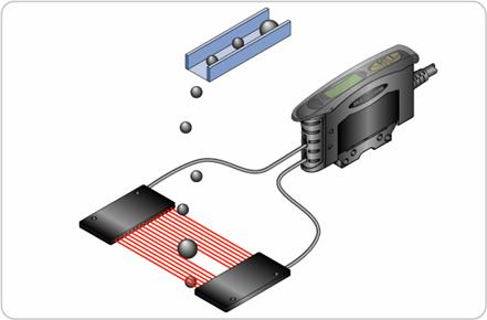 汽車生產(chǎn)制造的過(guò)程中, 會(huì)有許許多多的小零部件的分離和計(jì)數(shù)問(wèn)題,D10專家型傳感器D10DNFP(帶雙開(kāi)關(guān)量輸出)配以一對(duì)16光束直線型塑料矩形光纖PIRS1X166UMPMAL可用于零件的計(jì)數(shù)和檢查,滾珠掉落穿過(guò)一對(duì)由16光束塑料光纖對(duì)射組成的光幕。D10的一個(gè)輸出用于對(duì)掉落的滾珠計(jì)數(shù)。另一個(gè)輸出被設(shè)定為在超過(guò)兩條光束被同時(shí)擋住時(shí)(說(shuō)明滾珠尺寸超標(biāo)),停止進(jìn)料。從而達(dá)到對(duì)從震動(dòng)進(jìn)料口掉落的滾珠計(jì)數(shù),并監(jiān)測(cè)超標(biāo)尺寸的滾珠(如圖2所示)。