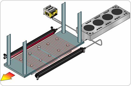 在發(fā)動(dòng)機(jī)的裝配過(guò)程中由于漏加工、加工錯(cuò)誤等原因會(huì)導(dǎo)致裝配不到位或根本無(wú)法裝配,造成對(duì)后續(xù)加工工藝的影響,產(chǎn)生產(chǎn)品品質(zhì)問(wèn)題和設(shè)備損壞問(wèn)題。例如,檢測(cè)氣缸頭孔洞,檢測(cè)平臺(tái)安裝于氣缸頭頂端,銷頂裝入平臺(tái)的孔中,隨后檢測(cè)平臺(tái)下降,銷釘落入下面氣缸的孔洞中,當(dāng)孔洞錯(cuò)位或無(wú)孔,銷釘無(wú)法下滑,高分辨率MINI-ARRAY將檢測(cè)到無(wú)法下滑的銷釘。如圖3所示。