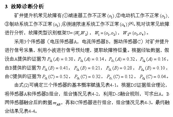 根據(jù)融合決策的方法,得出融合的決策結(jié)果是O1,即減速器工作不正常。從計算結(jié)果可以看出,通過A相和B相融合后,不確定的基本概率賦值大于設(shè)定門限,不能識別故障類型。將其結(jié)果再和C傳感器融合后,故障不確定性的基本概率賦值下降到 ,可以識別故障類型。可見,利用單一傳感器對礦井提升機進行故障診斷,可信度比較低,有時無法準確識別故障類型,而利用多傳感器進行識別,可提高故障識別率。