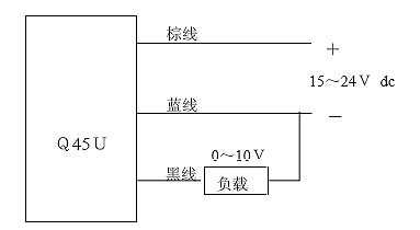 Q45ULIU64ACR 型超聲波傳感器將測(cè)量的距離值轉(zhuǎn)換為模擬量(電壓或電流)輸出?蓹z測(cè)范圍為100mm~3.0m,分辨率為距離的0.1%(最小0.25mm),線(xiàn)性度為滿(mǎn)量程的1%,并帶有溫度補(bǔ)償。由于車(chē)鉤的標(biāo)稱(chēng)高度大多在880mm 左右,允許檢測(cè)誤差為±0.2%,因此該傳感器能夠滿(mǎn)足系統(tǒng)要求。Q45U傳感器接線(xiàn)方式如圖3 所示,圖中棕線(xiàn)、藍(lán)線(xiàn)和黑線(xiàn)分別為傳感器電源正極、負(fù)極和電壓輸出。其中模擬量0~10V線(xiàn)性對(duì)應(yīng)于一定范圍的距離值,其輸出經(jīng)分壓電路(將0~10V降為0~5V以適應(yīng)單片機(jī)A/D轉(zhuǎn)換器的輸入要求)接入單片機(jī)的A/D 轉(zhuǎn)換器。由A/D 轉(zhuǎn)換器采樣測(cè)得電壓值,經(jīng)程序處理得出高度值。