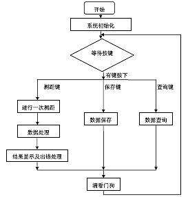 按下開(kāi)關(guān)鍵啟動(dòng)系統(tǒng)后,系統(tǒng)將進(jìn)行各部件的初始化,等待鍵盤(pán)的輸入。若按下測(cè)距鍵,系統(tǒng)將控制超聲波傳感器發(fā)射超聲波,接收回波,處理數(shù)據(jù),得出測(cè)量值并通過(guò)顯示器顯示出來(lái),供用戶(hù)保存或其它處理;若按下保存鍵,系統(tǒng)自動(dòng)對(duì)測(cè)量得到的數(shù)據(jù)進(jìn)行保存供用戶(hù)以后查詢(xún);若按下查詢(xún)鍵,即可對(duì)歷史測(cè)量數(shù)據(jù)進(jìn)行查詢(xún)?cè)L問(wèn),鍵盤(pán)上還設(shè)有向上和向下翻頁(yè)的按鍵,方便用戶(hù)查詢(xún)。