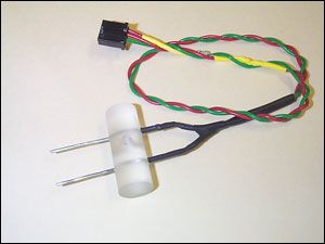 水監(jiān)測(cè)傳感器探頭如圖1所示,如上所述,該傳感器不是針對(duì)最終產(chǎn)品設(shè)計(jì)的。它由一片塑膠材料固定屏蔽夾子形狀的電極。電極之間的距離可以任選或由具體材料決定。傳感器通過一個(gè)間距為0.1的4引腳連接器直接連接到MAXQ3210評(píng)估板的J4 (引腳9-P0.4、11-P0.5/CMPI和13-P0.6)。1.0M電阻(圖中靠近連接器的導(dǎo)線部分)作為傳感器電極的一個(gè)上拉電阻,該電阻直接焊接到連接器的一個(gè)引腳。