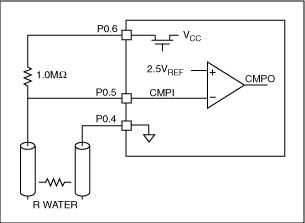 水監(jiān)測(cè)傳感器探頭與處理器的連接原理圖如圖2所示。傳感器一端連接至MAXQ3210的內(nèi)部模擬比較器輸入端CMPI,P0.5。該輸入還與1.0M電阻相連,電阻的另一端接處理器的端口引腳,P0.6。軟件將P0.6配置為輸出,并在系統(tǒng)初始化部分將其置為高電平。由于比較器具有高輸入阻抗,這種配置在正常條件下使CMPI接近于VCC (例如,傳感器電極沒有浸入水中)。傳感器的另一端連接至端口P0.4,P0.4配置為輸出引腳并置為低電平。當(dāng)兩個(gè)傳感器電極都浸入水中時(shí),水的電導(dǎo)率強(qiáng)行比較器輸入下拉至地。發(fā)生這種情況時(shí),比較器輸出CMPO改變。關(guān)于模擬比較器及其工作的詳細(xì)信息將在本文的后續(xù)內(nèi)容討論。