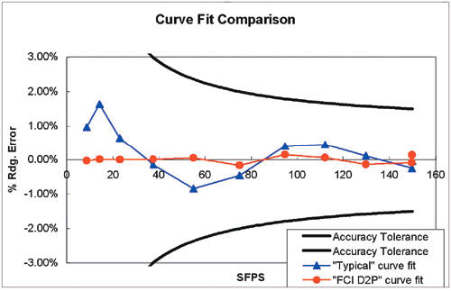 當(dāng)熱式傳感技術(shù)在一致性和穩(wěn)定性方面不斷發(fā)展時(shí),信號(hào)處理及硬件方面也有了突破性進(jìn)展。FCI在標(biāo)定數(shù)據(jù)收集和信號(hào)處理方面取得了進(jìn)展,并且通過(guò)先進(jìn)的曲線擬合演算法逐步提高了產(chǎn)品性能。下圖展示了FCI突破性的曲線擬合方法,這種方法提高了產(chǎn)品性能和精度。從圖1的常見(jiàn)誤差差頻寬可以看出傳統(tǒng)型產(chǎn)品的局限性。而采用D2P曲線擬合方法的FCI的熱式質(zhì)量流量計(jì),與傳統(tǒng)型產(chǎn)品形成了鮮明對(duì)比。近年來(lái),誤差和不確定性縮減有了重大進(jìn)展,使FCI產(chǎn)品在保持1001量程比的前提下,達(dá)到了0.5%的標(biāo)定精度。