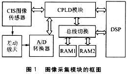圖像采集模塊的框圖如圖1所示,CIS圖像傳感器在CPL的控制下,將每一個(gè)像素的灰度值以模擬電壓值的形式通過串行移位方式傳輸出來,某個(gè)像素的電信號(hào)再經(jīng)過差動(dòng)放大器電路進(jìn)行信號(hào)調(diào)理后,由A/D轉(zhuǎn)換器將模擬電壓轉(zhuǎn)換數(shù)字量,通過總線的切換實(shí)現(xiàn)雙存儲(chǔ)區(qū)輪換工作,然后在CPLD的控制下,將轉(zhuǎn)換后的數(shù)字信號(hào)暫存在存儲(chǔ)器RAM中。
