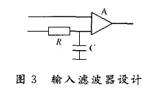 對于高精度mV 級的DC放大器 ,其各種交流干擾都將成為放大器寄生信號的重要信號源,因此,必須在運(yùn)算放大器的輸入端加輸入濾波器,通常由一個(gè)大電阻(4.7 kΩ)和一個(gè)小電容(3.3μF)構(gòu)成RC濾波,如圖3所示。