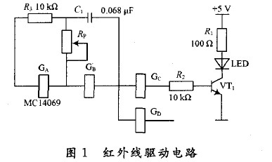 為減少自然光、照明光和其他干擾光的影響,需對反相器電路產(chǎn)生的脈沖輸出進(jìn)行脈沖調(diào)制,反相器中的GA和GB構(gòu)成振蕩電路,如果反相器GA和GB的門限電平為1/2Ucc(Ucc為MC14069電源電壓),則電路的振蕩頻率f,由電容C1和電位器Rp 的值決定,即f=1/(2.2Rc)。其中,R為Rp的阻值,C為C1 的電容值。