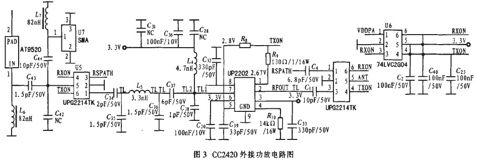 其電容值約為22 pF。射頻輸入,輸出匹配電路主要用于匹配器件的輸入輸出阻抗,使其輸入輸出阻抗為50 n,同時(shí)為CC2420器件內(nèi)部的PA及LNA提供直流偏置。如果兩節(jié)點(diǎn)相距較遠(yuǎn)。而且不易安裝中間節(jié)點(diǎn)中繼,可采用增加功放電路提高輸出功率的方法實(shí)現(xiàn)較遠(yuǎn)距離的傳輸。圖3為功放電路圖。74LVC2G04是雙非門緩存器用于控制UPG221411單刀雙擲開關(guān)。選通發(fā)送或接收電路,而UP2202是一款高增益2.4 Hz功放器件。用于提高射頻電路的輸出功率。這種帶功放的節(jié)點(diǎn)一般應(yīng)用于簇頭節(jié)點(diǎn)或匯聚節(jié)點(diǎn),以及溝壑地帶等不易連接且相距較遠(yuǎn)的節(jié)點(diǎn)問數(shù)據(jù)傳輸。當(dāng)然。這種節(jié)點(diǎn)消耗較大。大大降低電池壽命,因此在人煙稀少或不易到達(dá)的地點(diǎn)。需采用可充電的電池供電(輸出電流達(dá)到120 mA),同時(shí)采用太陽(yáng)能板為電池充電。