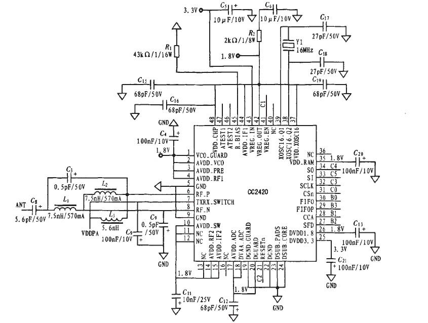 偏遠(yuǎn)地區(qū)的工業(yè)設(shè)施、軍事裝備的監(jiān)控系統(tǒng)具有無人值守、低數(shù)據(jù)量和點(diǎn)多面廣等特點(diǎn)。該監(jiān)控系統(tǒng)應(yīng)用ZigBee無線傳感器網(wǎng)絡(luò)傳輸數(shù)據(jù)。采用電池供電,因此,網(wǎng)絡(luò)節(jié)點(diǎn)的功耗為系統(tǒng)設(shè)計(jì)的關(guān)鍵。CC2420采用低電壓供電(2.1~3.6 V),并具有休眠模式,且從休眠模式激活的時(shí)延短,因此,功耗大大減小。CC2420各狀態(tài)下的電流消耗典型值為:穩(wěn)壓器關(guān)閉為0.02 μA。低電位模式為20μA,空閑模式為426μA.接收模式為18.8 μA,發(fā)送模式(如Ⅳ=0 dBm)為17.4 μA。另外,PICl8F4620也是一款低電壓供電的器件(2.0~5.5 V)。并具有運(yùn)行、空閑、休眠3種功耗管理模式,合理利用這些功耗管理模式可獲得理想的節(jié)能效果。該系統(tǒng)設(shè)計(jì)的3.3 V穩(wěn)壓電源是由兩節(jié)五號(hào)電池或9 V方型鎳氫電池穩(wěn)壓至3.3 V的電源來提供。圖2為CC2420射頻收發(fā)器的應(yīng)用電路。