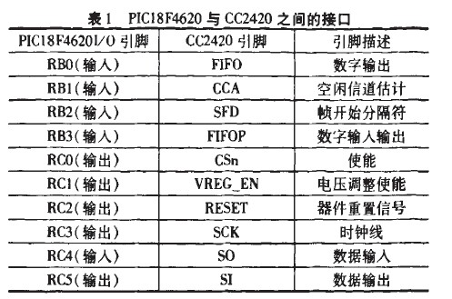 所以。選擇一款低能耗的通信器件將節(jié)省節(jié)點(diǎn)能量,延長(zhǎng)壽命。在ZigBee無線傳感器網(wǎng)絡(luò)應(yīng)用中,射頻收發(fā)器CC2420工作在從機(jī)模式。PICl8F4620 T作在主機(jī)模式,通過SPl接口配置CC2420寄存器參數(shù)和讀寫緩沖器內(nèi)的數(shù)據(jù),詳細(xì)的引腳連接如表1所示。