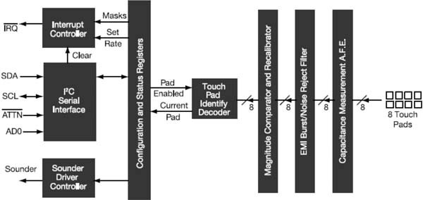 當物體(例如我們高度絕緣和導電的身體上的一個手指)靠近金屬電極時,就形成了一條電路徑,從而導致電場電流發(fā)生變化。正常情況下,傳感器測量產(chǎn)生電的電場中的AC阻抗,并且將將測量轉(zhuǎn)化成DC輸出電壓。帶有模數(shù)控制器(ADC)的外部微控制器然后會處理這個信息,以執(zhí)行任意數(shù)量的功能,例如與觸摸板控制面板相關的功能。但是,我們更先進的MPR083和MPR084近接電容式觸摸傳感器控制器則通過帶定制尋址的內(nèi)置集成電路(I2C)生成數(shù)字輸出,因此不需要外部ADC。