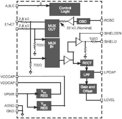 在近接電容式傳感器中,飛思卡爾使用了多種技術。MC33794、MC33941和MC34940產(chǎn)品系列在傳感器集成電路(IC)中包含振蕩器電路,以生成高純度、低頻率5V正弦波,并由39000歐姆負載電阻器進行調(diào)節(jié)。這個AC信號被饋入復用器里,復用器然后將信號定向傳輸?shù)竭x定的電極/參考引腳或內(nèi)部測量節(jié)點上。IC自動把未選的節(jié)點連接到電路接地中,充當創(chuàng)建電場電流所需的返回路徑。