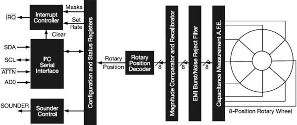 MPR083近接電容式觸摸傳感器控制可以控制8方向旋轉(zhuǎn)觸摸輪和線性滑軌應用。電容式滑軌是一個延伸的觸摸板,可以沿滑軌長度檢測手指位置。原始檢測輸出是一個給出觸摸條件的單位和一個給出位置信息的多位字。