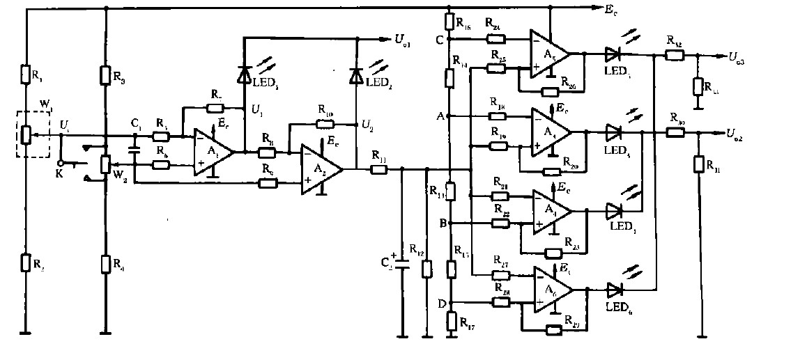 運(yùn)放A3、A4和A5、A6分別組成窗口比較器,電阻R20、R23、R26、R29是阻值較大的正反饋電阻,以改善運(yùn)放的開(kāi)關(guān)狀態(tài)工作性能,電阻R13~R17為分壓電阻,且應(yīng)R14=R15,R16=R17,電阻R13中點(diǎn)處的電位為(12)Ec,分壓電阻的阻值應(yīng)根據(jù)U2的變化所反應(yīng)的傾翻力決定,使得運(yùn)放A3和A5的反相輸入端、運(yùn)放A4和A6的同相輸入端獲得不同的開(kāi)關(guān)轉(zhuǎn)換基準(zhǔn)電位,而且所反應(yīng)的左右傾斜程度是一致的。水平時(shí),U2=(12)Ec,運(yùn)放A3~A6均輸出低電平;傾斜時(shí),U2的電位發(fā)生變化,運(yùn)放A3~A6按規(guī)定要求輸出高電平。例如,電位器W1左擺時(shí),使U2電位升高,當(dāng)高于A點(diǎn)電位時(shí),運(yùn)放A3輸出高電平,二極管LED3顯示傾斜方向,若汽車(chē)?yán)^續(xù)向左傾斜,使U2電位繼續(xù)升高,當(dāng)高于C點(diǎn)電位時(shí),運(yùn)放A5輸出高電平,二極管LED5顯示傾斜方向且程度加重;同理,若電位器W1右擺,運(yùn)放A4和A6的工作亦如此。2個(gè)輸出端Uo2和Uo3輸出的數(shù)字信號(hào)所反映傾斜程度與傾斜方向無(wú)關(guān),很明顯,Uo3有高電平信號(hào)輸出時(shí),Uo2已經(jīng)輸出高電平,Uo3所反映的傾斜程度大于Uo2。