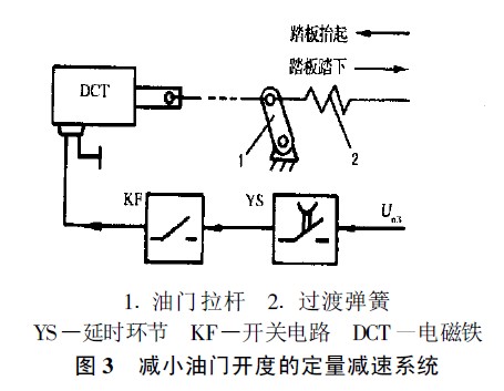 由傳感器電路發(fā)出的數(shù)字信號(hào),控制執(zhí)行元件(如電磁鐵)組成減小發(fā)動(dòng)機(jī)油門(mén)開(kāi)度的定量減速系統(tǒng),如圖3所示。汽車(chē)正常行駛時(shí),油門(mén)拉桿由油門(mén)踏板控制,電磁鐵中的動(dòng)鐵心隨油門(mén)拉桿同步移動(dòng);當(dāng)汽車(chē)側(cè)向傾斜(指速度、轉(zhuǎn)彎半徑及路面坡度的綜合值,下同)超過(guò)設(shè)定值時(shí),傳感器電路輸出端Uo3發(fā)出信號(hào),經(jīng)延時(shí)環(huán)節(jié)YS(如時(shí)間繼電器,Uo3消失后,YS延時(shí)斷開(kāi),若阻尼和電路的延時(shí)足夠,可以不設(shè)),開(kāi)關(guān)量放大環(huán)節(jié)KF(如繼電器),使電磁鐵DCT得電工作,動(dòng)鐵心迅速移動(dòng)至終止位置,帶動(dòng)油門(mén)拉桿,使油門(mén)開(kāi)度突然減小。