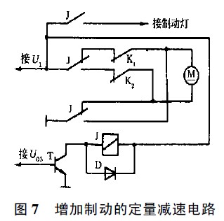 當(dāng)拉桿處于圖6中所示位置時(shí),限位開(kāi)關(guān)K1被壓開(kāi)(K1的狀態(tài)與圖7和圖8中的狀態(tài)相反),使電動(dòng)機(jī)處于待命狀態(tài)。當(dāng)圖2中的輸出端Uo3有高電平信號(hào)輸出時(shí),圖7中的三極管T導(dǎo)通,繼電器J得電,觸點(diǎn)轉(zhuǎn)換,使電動(dòng)機(jī)經(jīng)限位開(kāi)關(guān)K2得到下正上負(fù)的電源而開(kāi)始轉(zhuǎn)動(dòng),使拉桿離開(kāi)限位開(kāi)關(guān)K1,帶動(dòng)制動(dòng)踏板向下,產(chǎn)生制動(dòng),經(jīng)過(guò)一段時(shí)間后,Uo3無(wú)高電平輸出,繼電器J返回,使電動(dòng)機(jī)經(jīng)限位開(kāi)關(guān)K1得到上正下負(fù)的電源而開(kāi)始反轉(zhuǎn)(在較短的時(shí)間內(nèi),電動(dòng)機(jī)處于反接制動(dòng)狀態(tài)下,對(duì)小容量的直流電動(dòng)機(jī),在使用上不會(huì)造成影響。也可增加延時(shí)后,使電動(dòng)機(jī)反轉(zhuǎn),本文略)。
